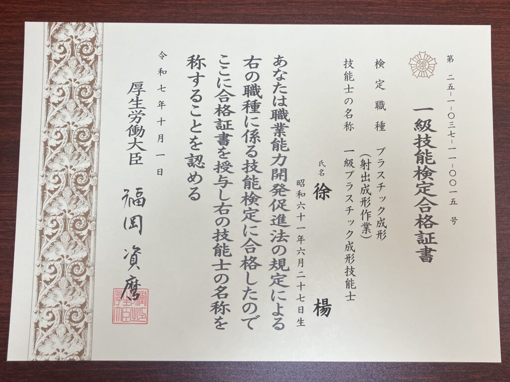 この度、弊社社員2名が国家検定である技能検定「1級プラスチック成形技能士」に見事合格いたしました。