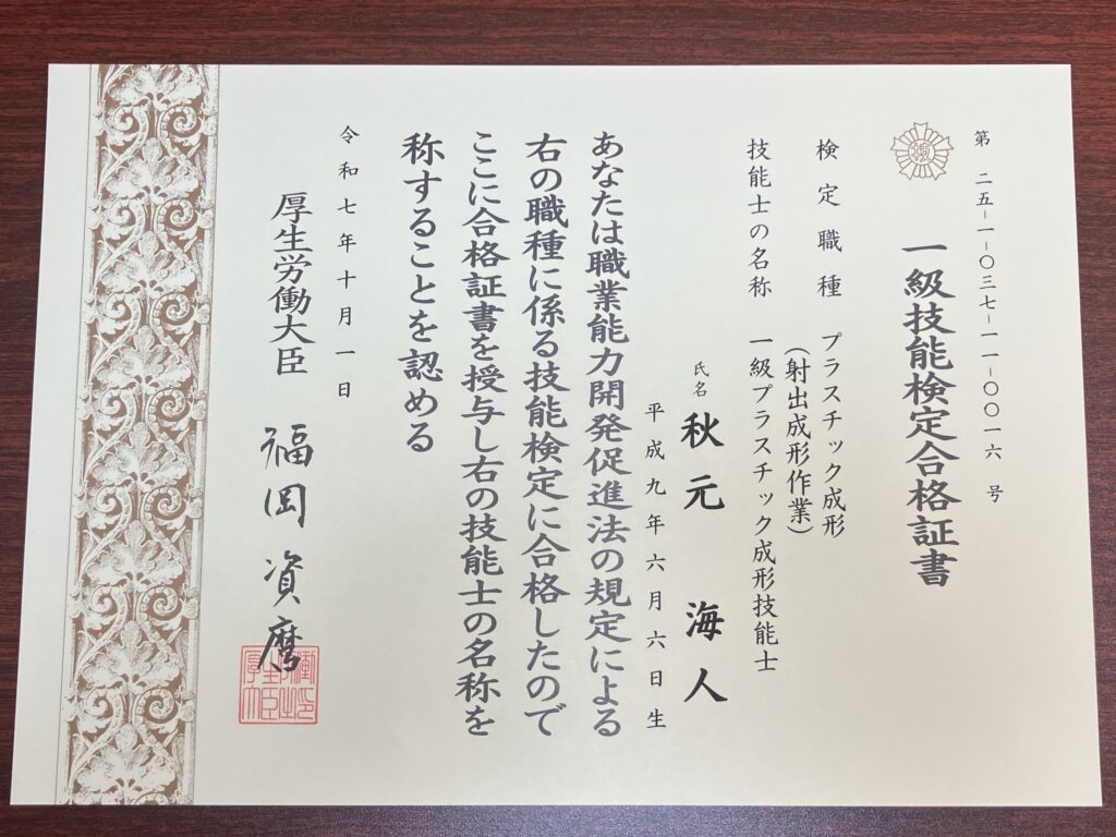 この度、弊社社員2名が国家検定である技能検定「1級プラスチック成形技能士」に見事合格いたしました。